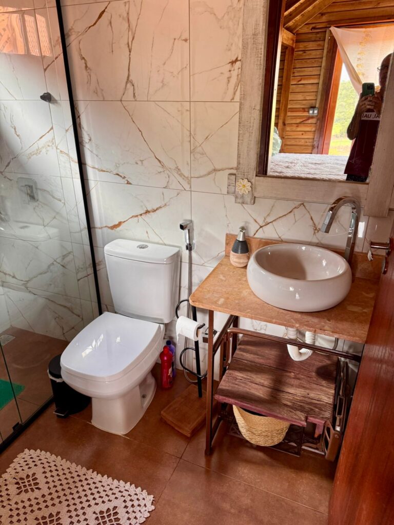 | Acomodações: | – Roupas de cama e banho, papel higiênico, sabonete e shampoo - Utensílios de cozinha – Todas as tomadas de energia são 220V. Confirme se seus aparelhos são compatíveis. – Economize energia. Ela é 100% solar e independente da rede elétrica. Desligue o que não estiver usando. A energia disponível à noite é a que foi acumulada durante o dia na bateria do sistema. Obs.: sem TV |
